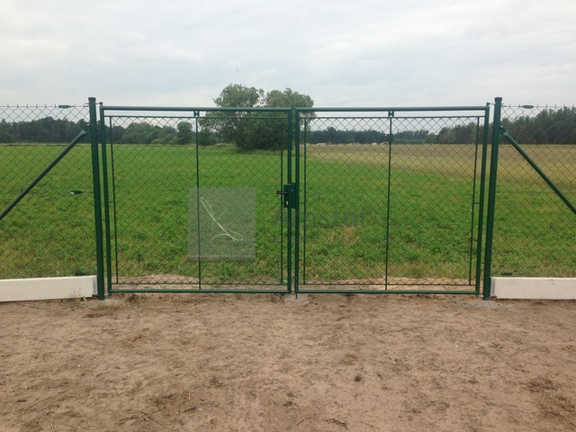 Plotová brána poplastovaná, výška 200 cm, šířka 360 cm. Povrchová úprava Zn+PVC. Barva zelená RAL 6005. Výplet poplastované pletivo oko 50x50 mm, síla drátu 2,5 mm.