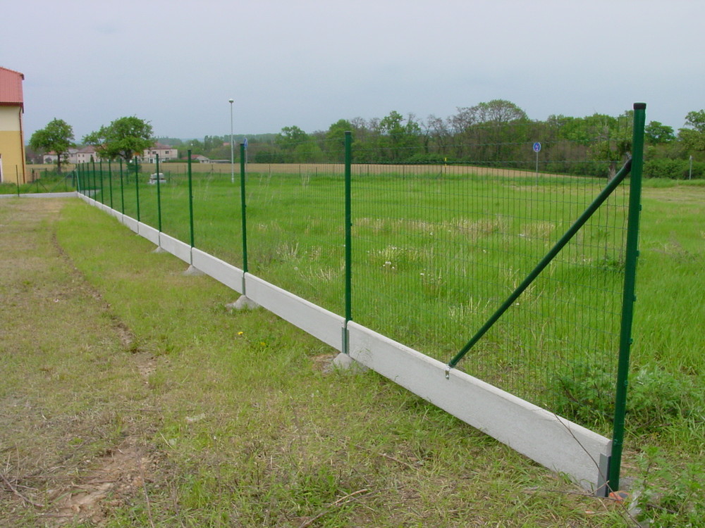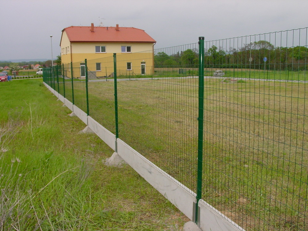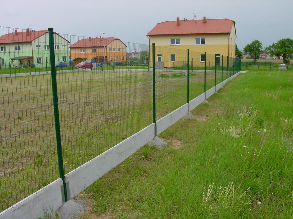 Svařované pletivo zelené, plotové sloupky 260/48 mm, plotové vzpěry 200/38 mm, držáky napínacího drátu šroubovací, podhrabové desky 3000/300/50 mm, držák podhrabové desky koncový, držák vzpěry k podhrabové desce Zn.