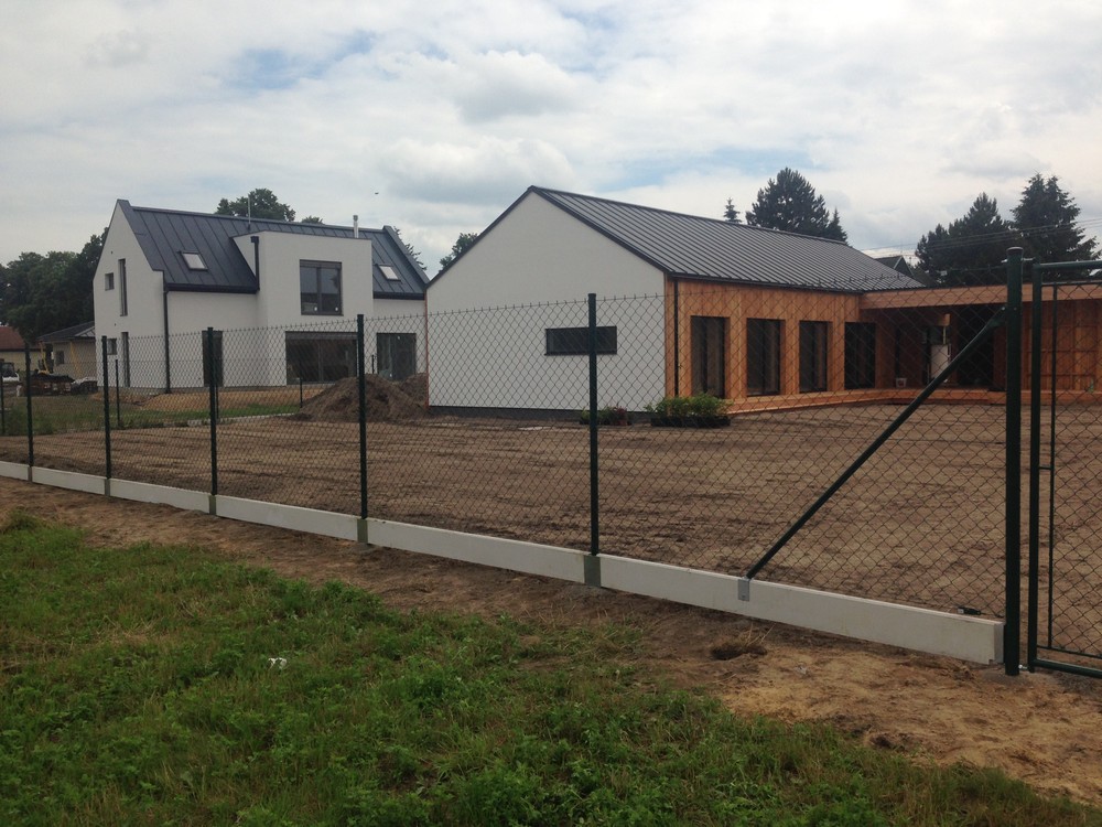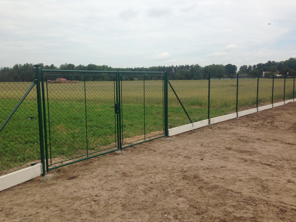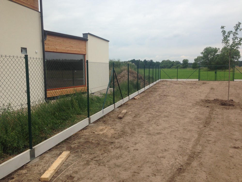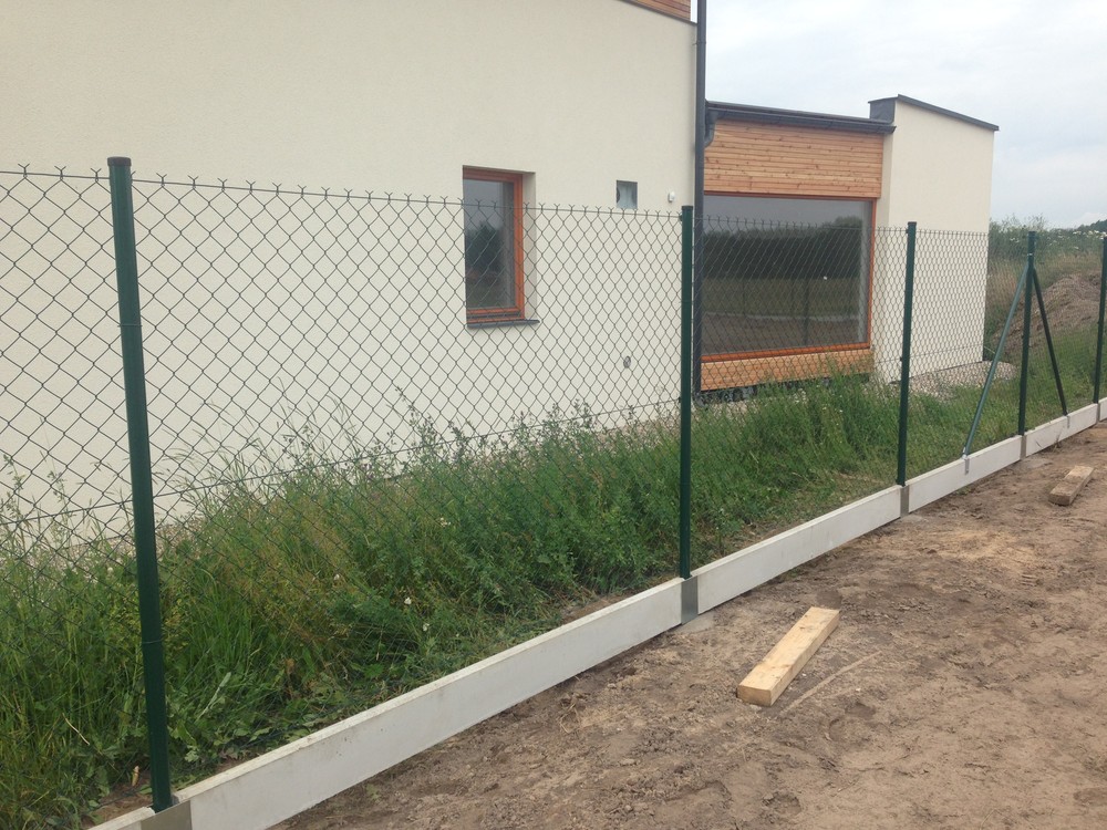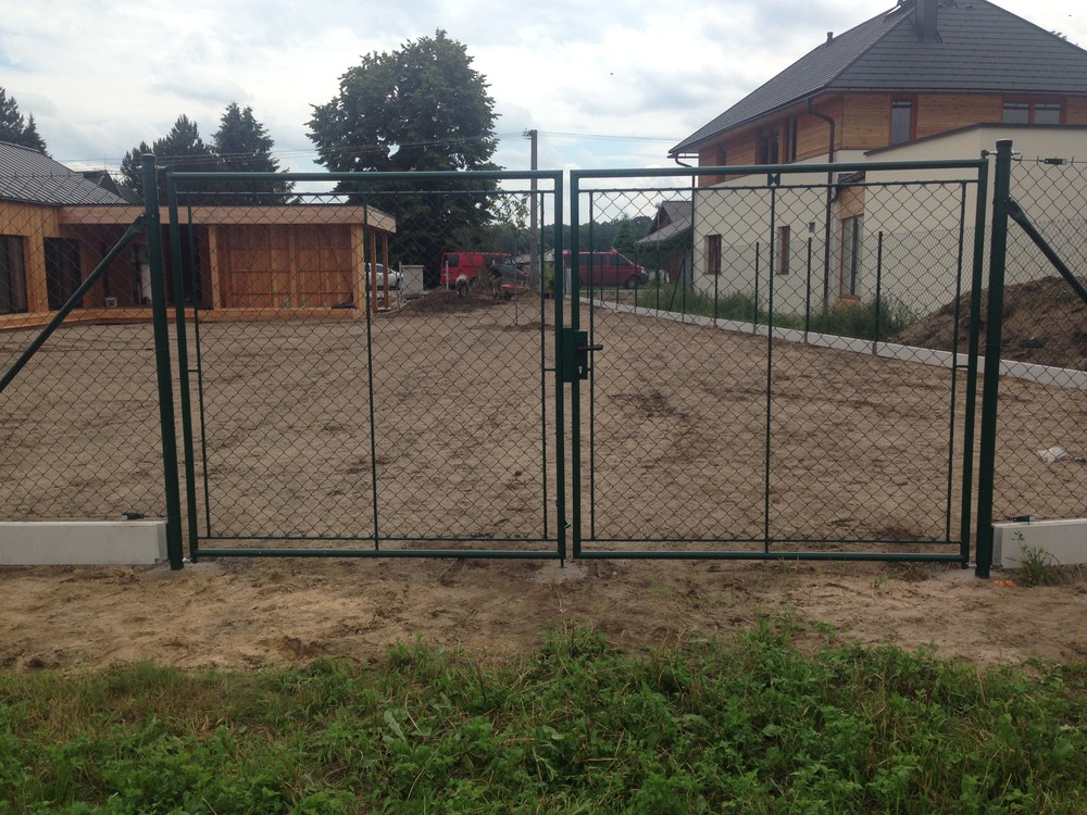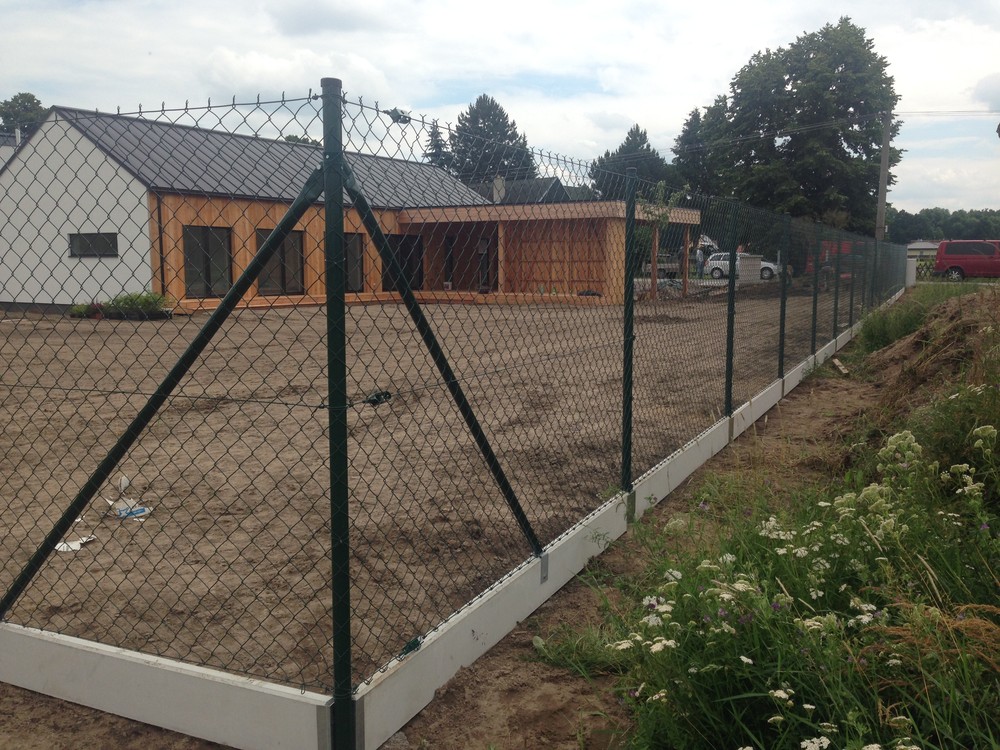 Pletivo poplastované zelené, podhrabová deska, držák podhrabové desky, držák vzpěry k podhrabové desce, vzpěra plotová, sloupek PVC, brána FAB, napínací drát, vázací drát, napínací ráčna (napínák), držák napínacího drátu. Stavba oplocení Královéhradecký kraj.