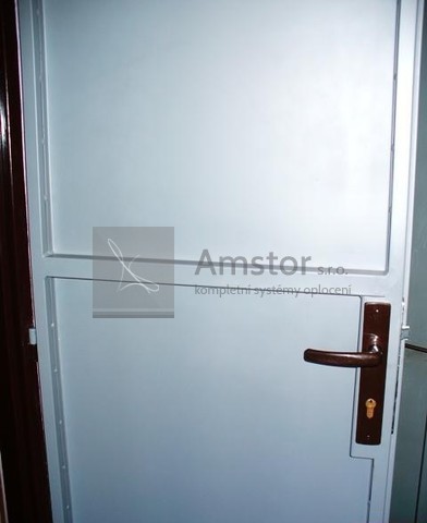 Dveře jsou vyrobeny z uzavřeného dveřního profilu - tvaru L a jednostranně zaplechovány plechem o síle 1mm, provedení levé nebo pravé. Dveře mají zámek pro vložku FAB a plastové kování. Pohledová strana dveří je ze strany pantů, otvírání k sobě !! Dveře je možno vyrobit také s větracími mřížkami. Možnost výroby zárubně z jeklu 40/40 mm.